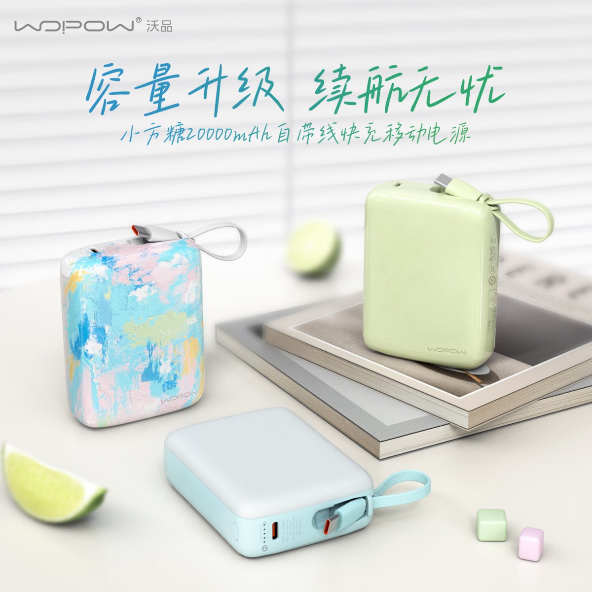 沃品 小方糖快充自带线移动电源 20000mAh SQ67 纯彩版(电商款)