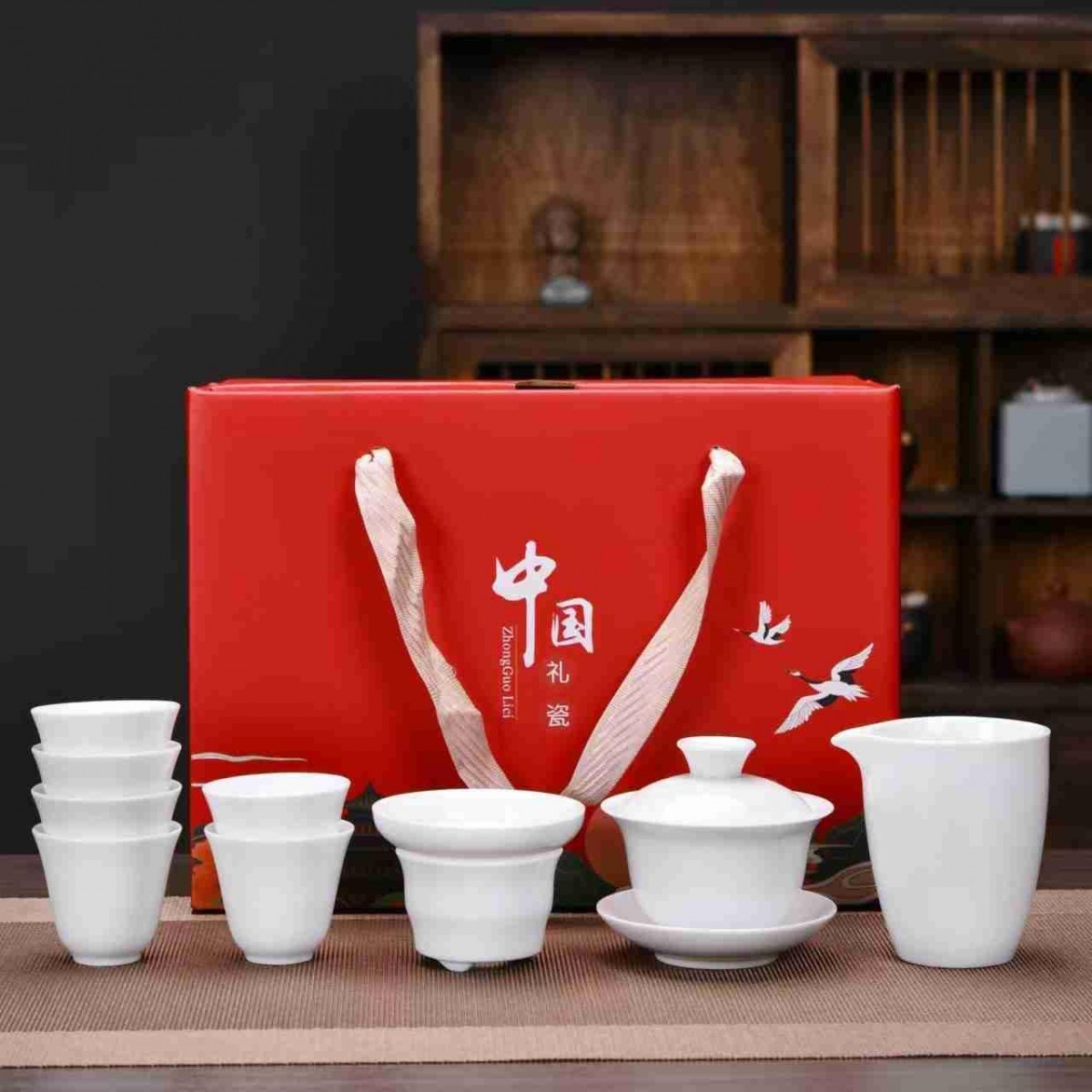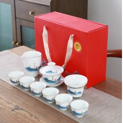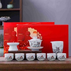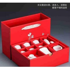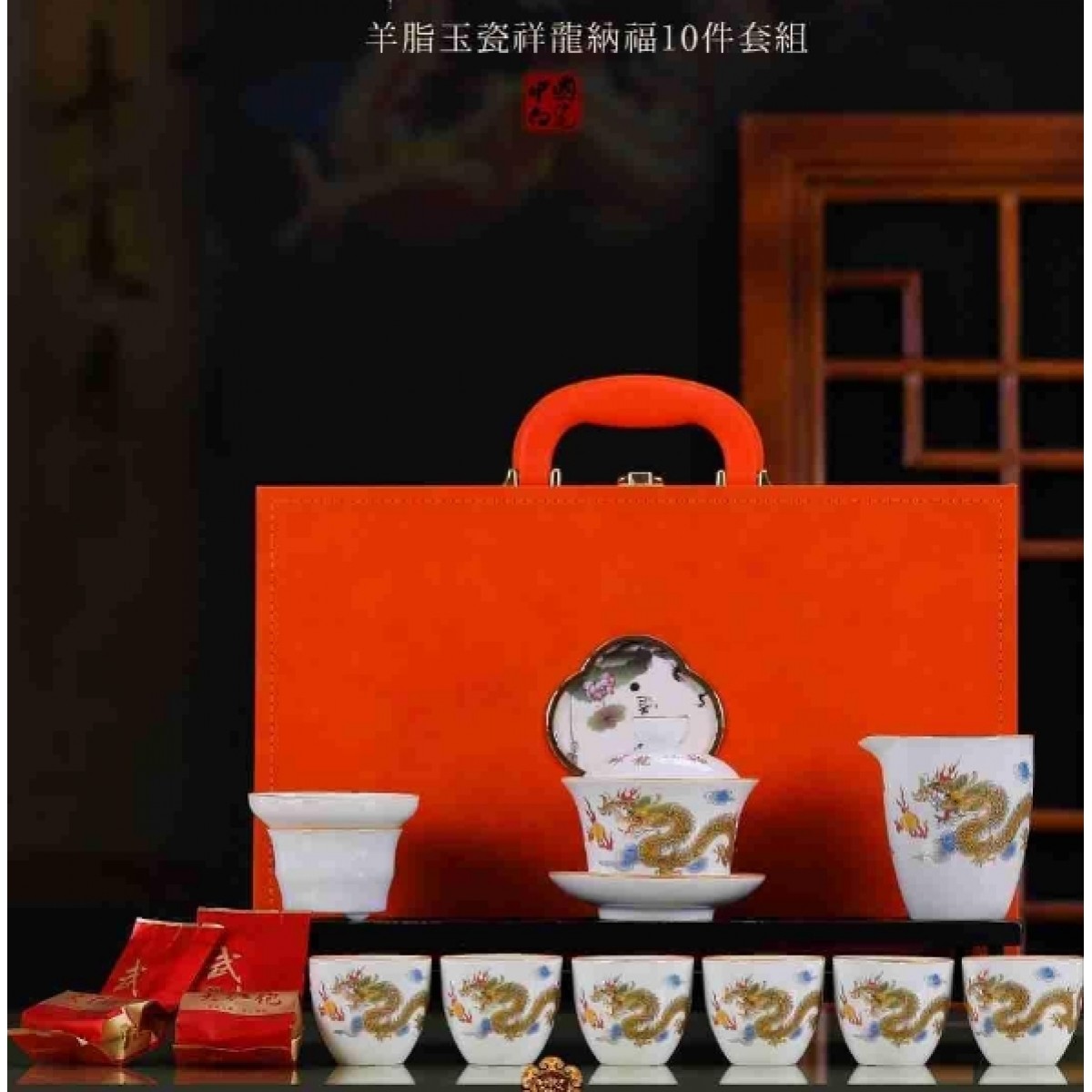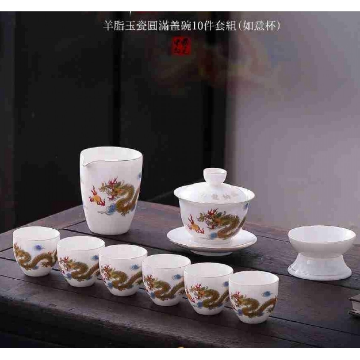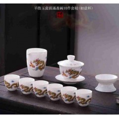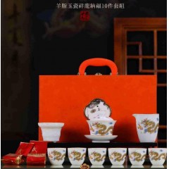 羊脂玉瓷圆满祥龙纳福10件套组(如意杯) 盖碗+公道杯+茶漏组+茶杯+茶叶+礼盒