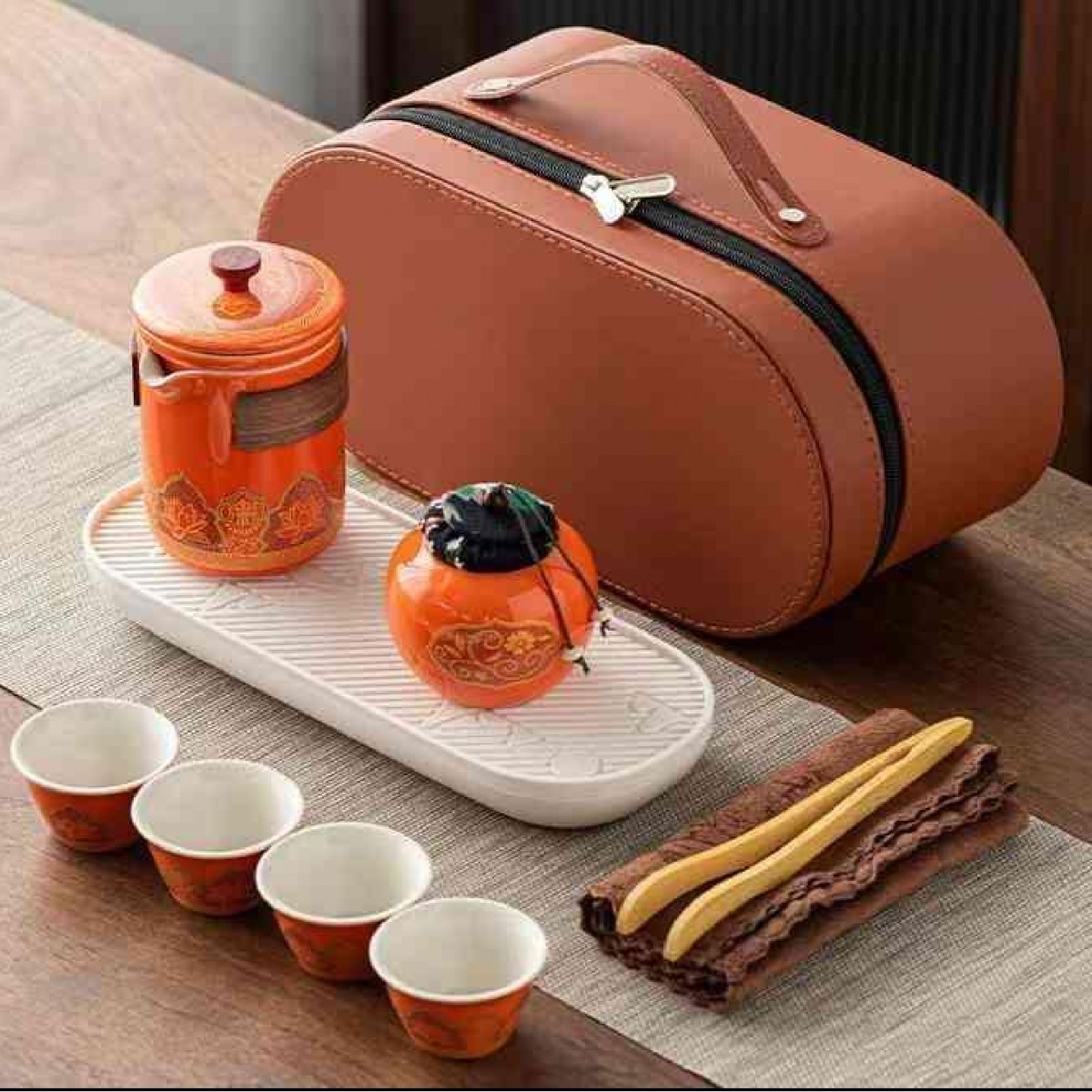 高端旅行茶具 壶+杯+茶盘+茶夹+毛巾