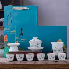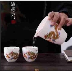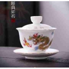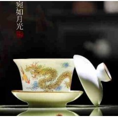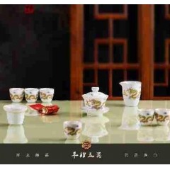 羊脂玉瓷祥龙纳福10件套组 盖碗+公道杯+茶漏组+茶杯+茶叶