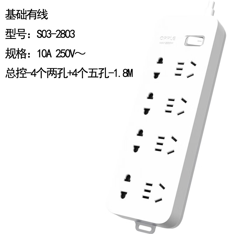 欧普照明(OPPLE)S03-2803 国标基础有线排插10A 250V~ 总控-4个两孔+4个五孔-1.8M