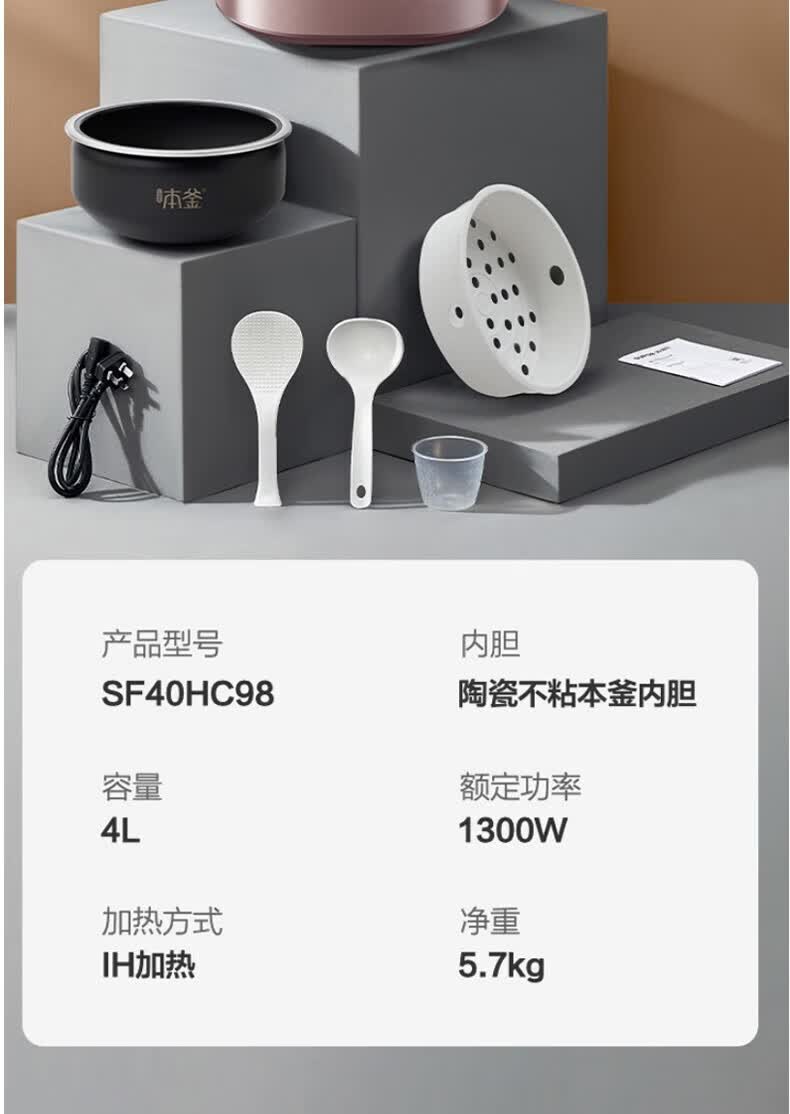商品名称:苏泊尔(SUPOR)小快本釜IH电饭煲 SF40HC98 4L