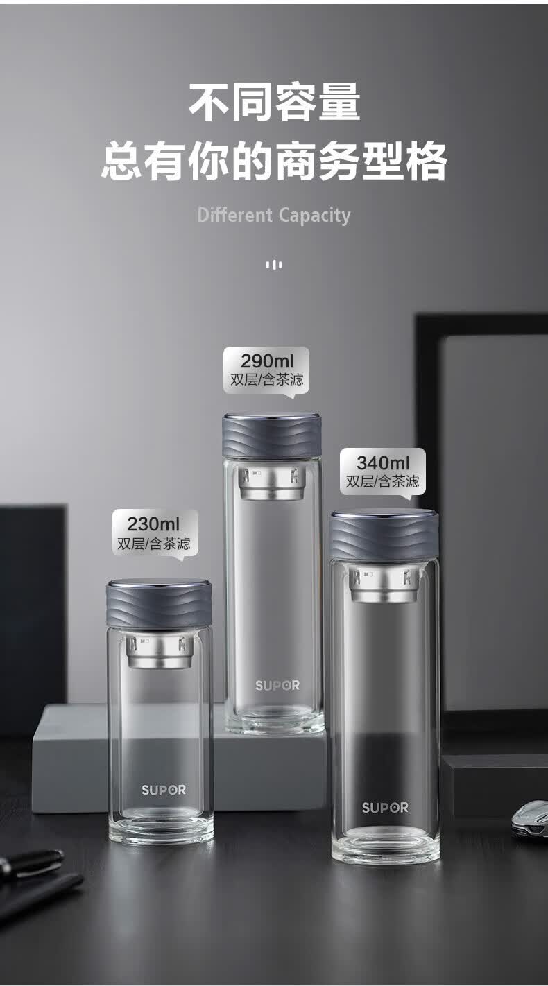 商品名称:苏泊尔(SUPOR) 沁·耐热玻璃杯.灰黑色/粉紫色 KC23GR10 230,ml