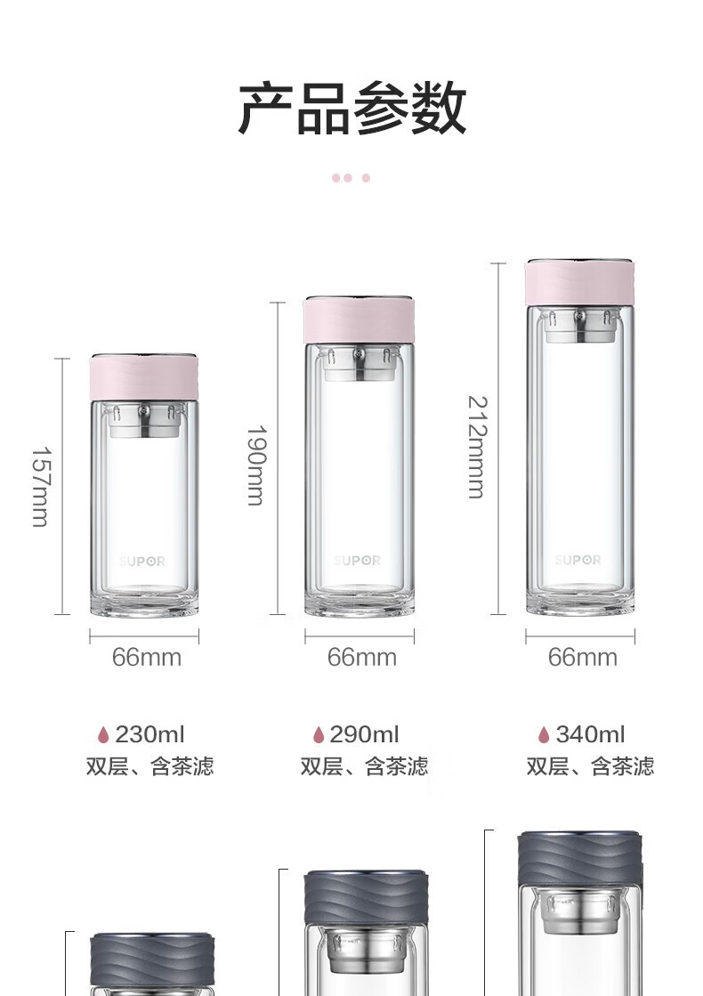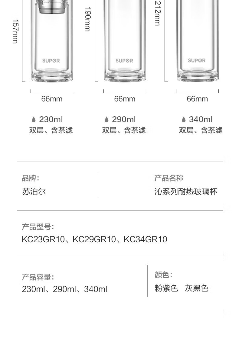 商品名称:苏泊尔(SUPOR) 沁·耐热玻璃杯.灰黑色/粉紫色 KC34GR10 340ML