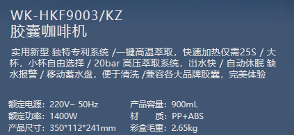 商品名称:康宁 WK-HKF9003/KZ 胶囊咖啡机