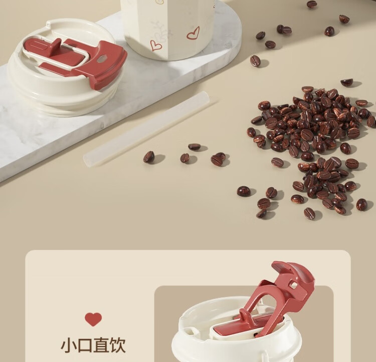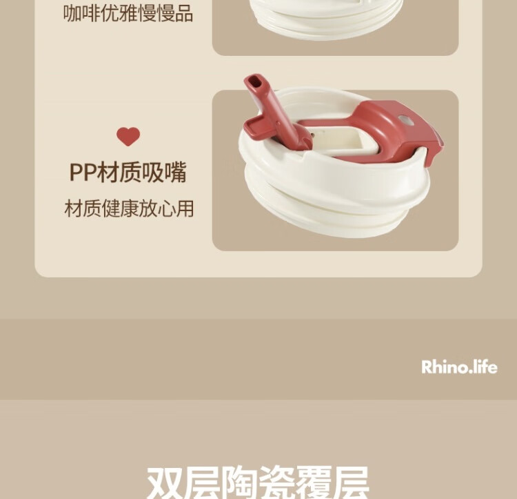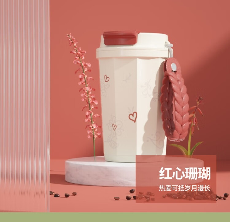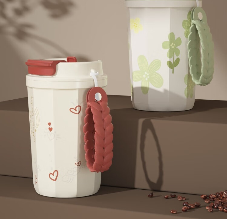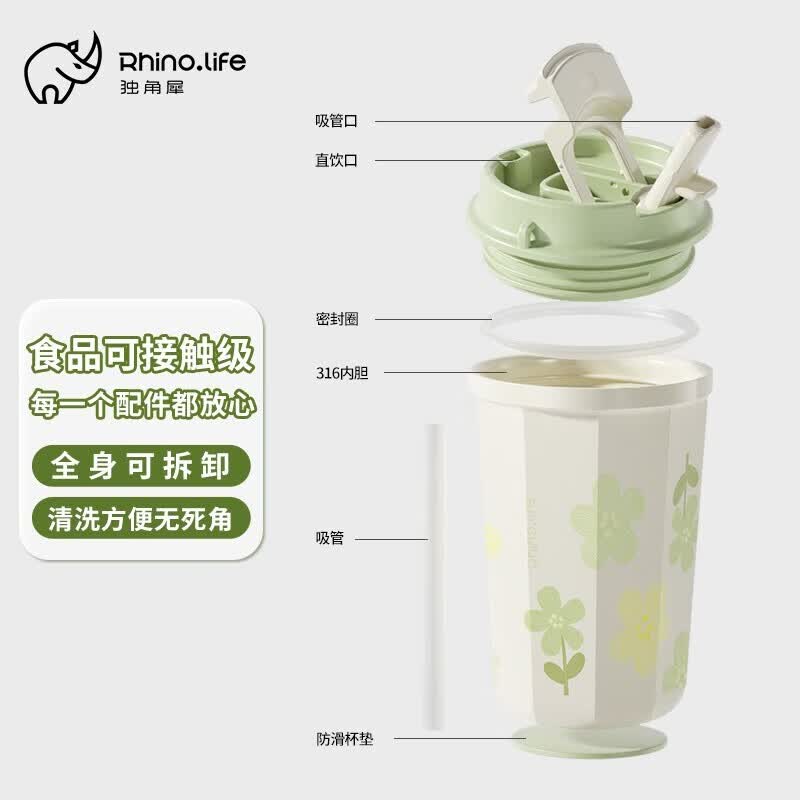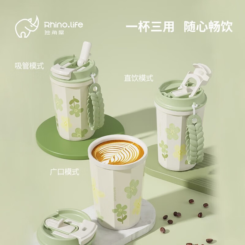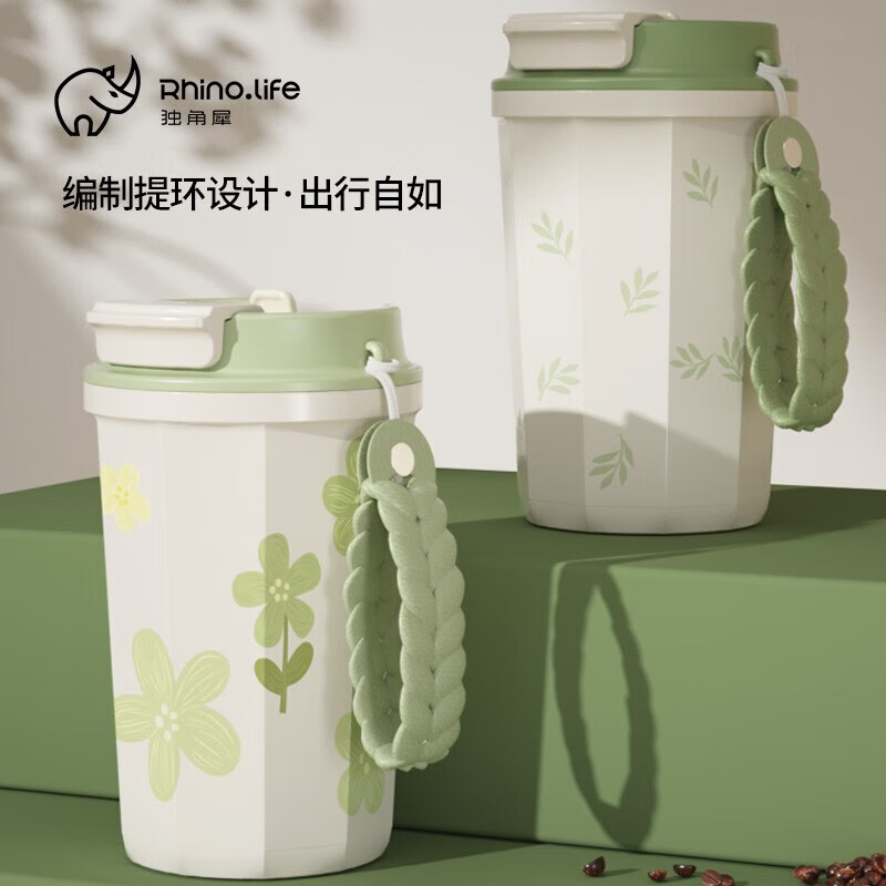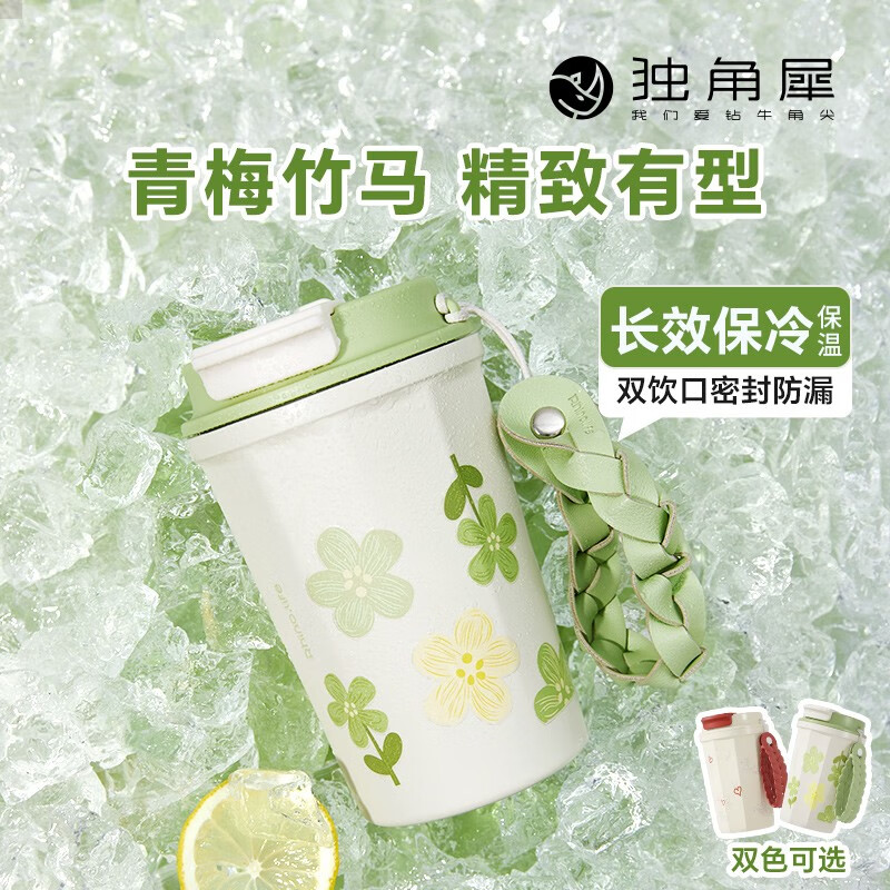 商品名称:独角犀 双饮口陶瓷内胆咖啡杯 春绿海棠 TD50202701
