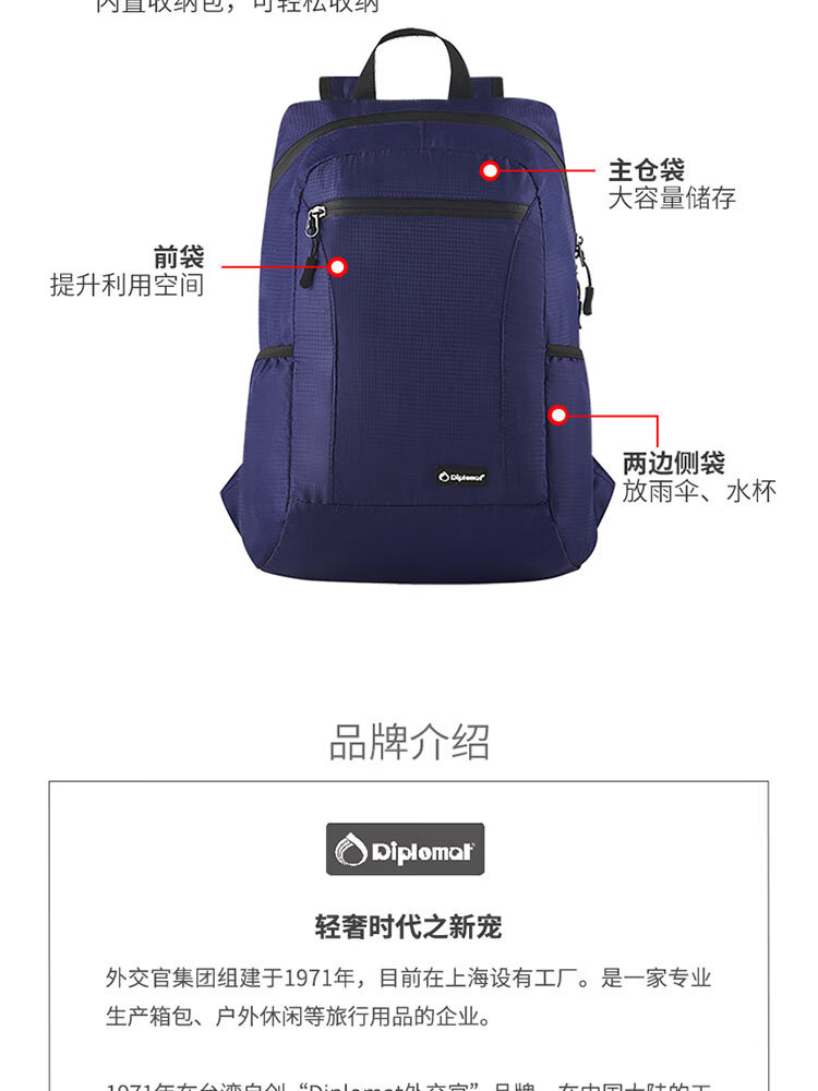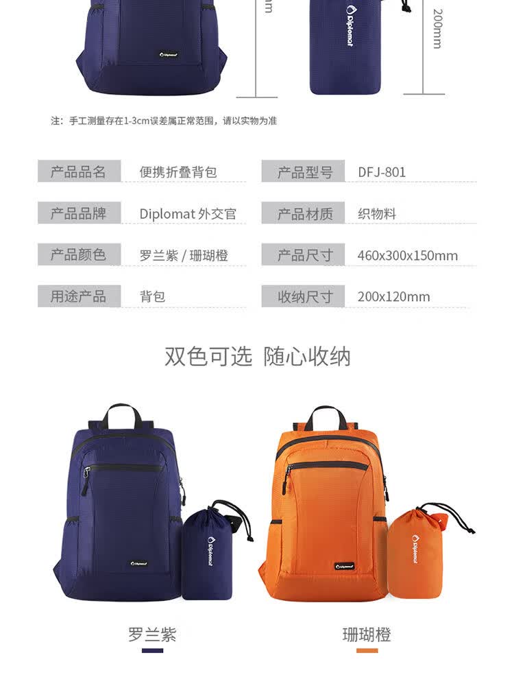 商品名称:Diplomat 外交官户外 便携折叠背包 DFJ-801(定制款)