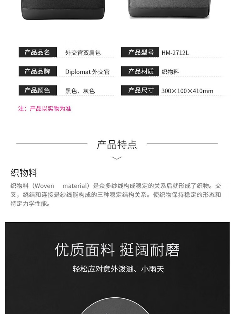 商品名称:Diplomat 外交官双肩包 HM-2712L-1/HM-2712L-2 黑色/灰色