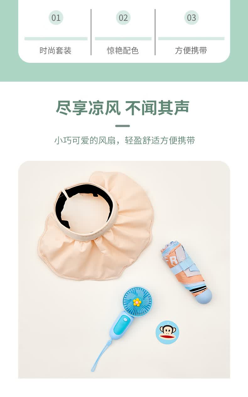 包装清单 :遮阳伞*1,小风扇*1,遮阳帽*1