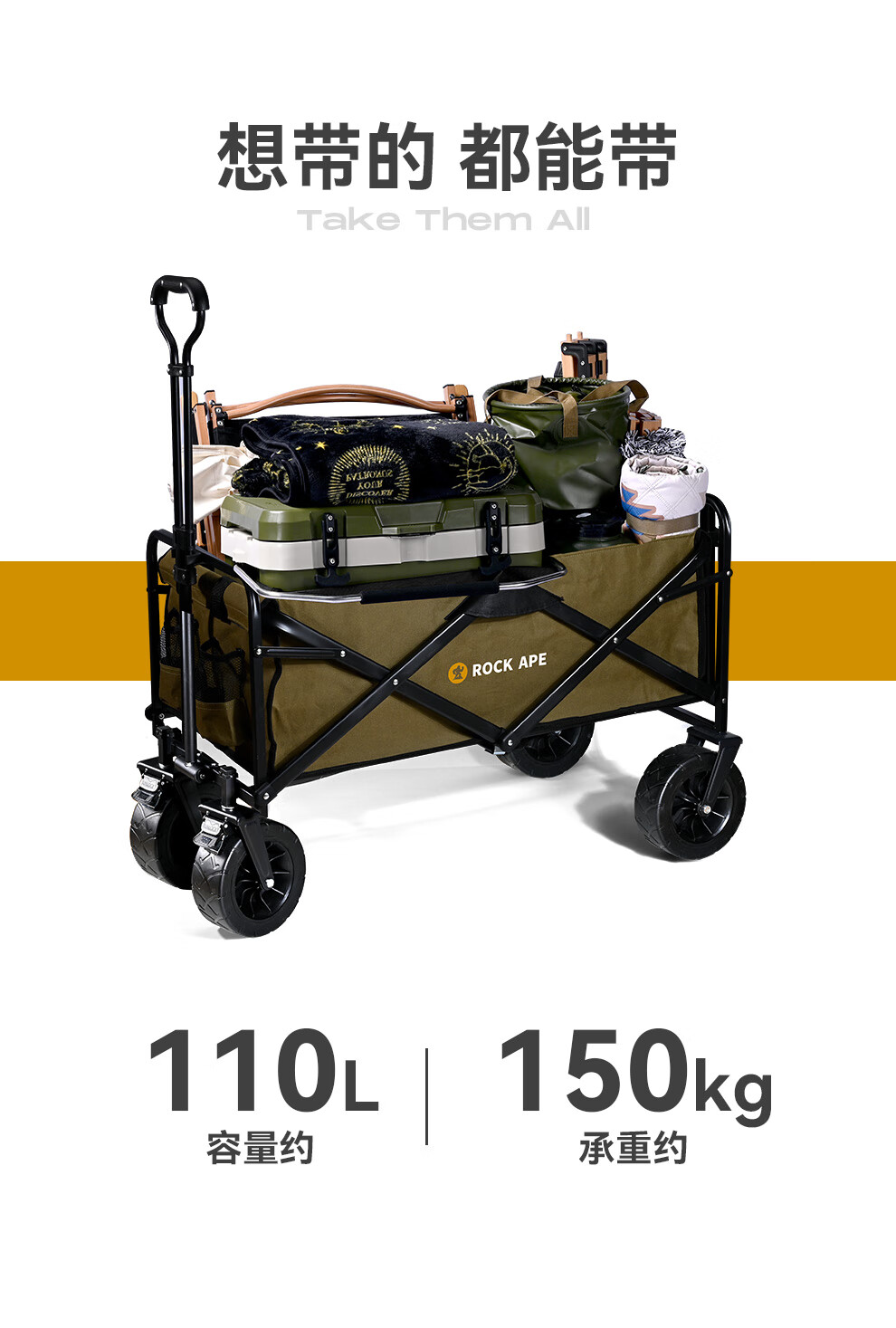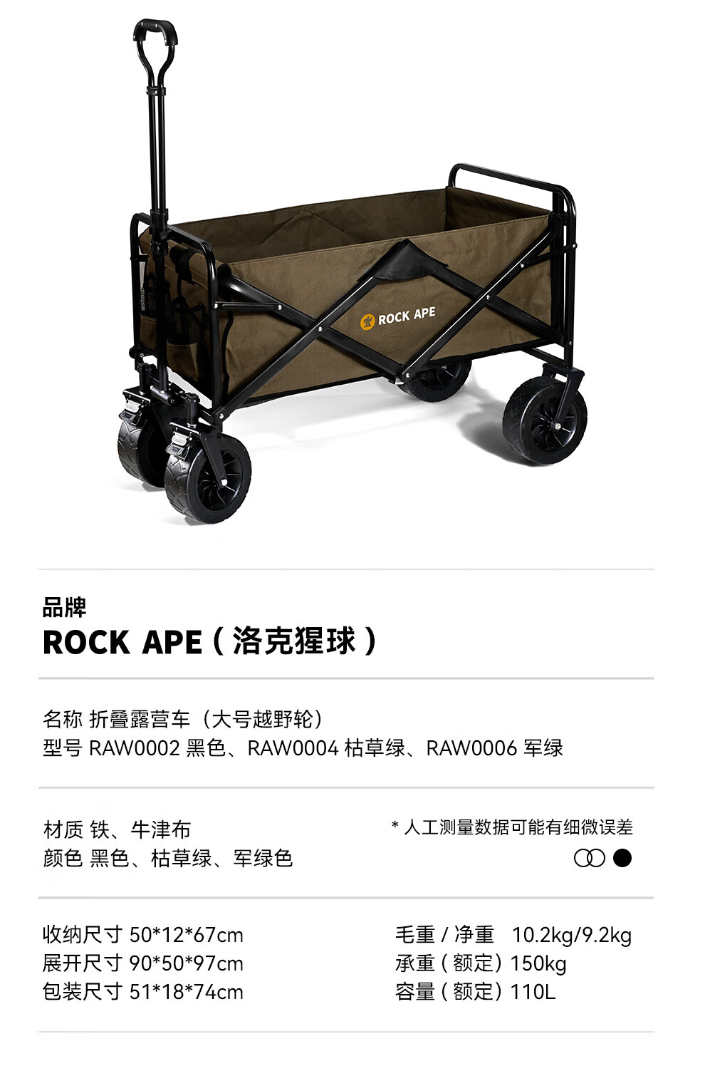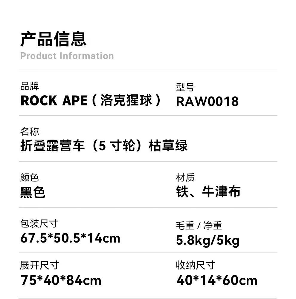 商品名称:洛克猩球 RockApe 折叠露营车(大号越野轮)枯草绿 RAW0004
