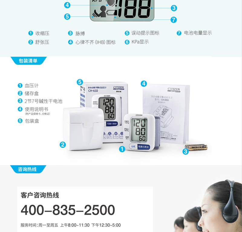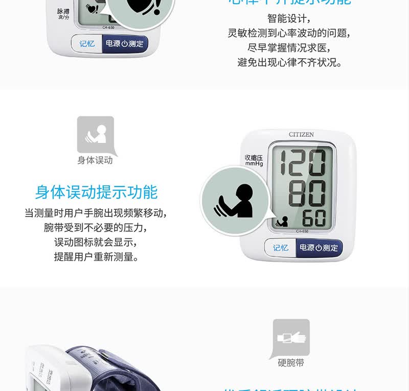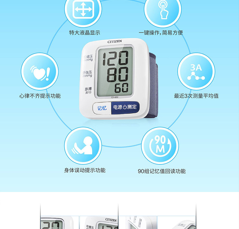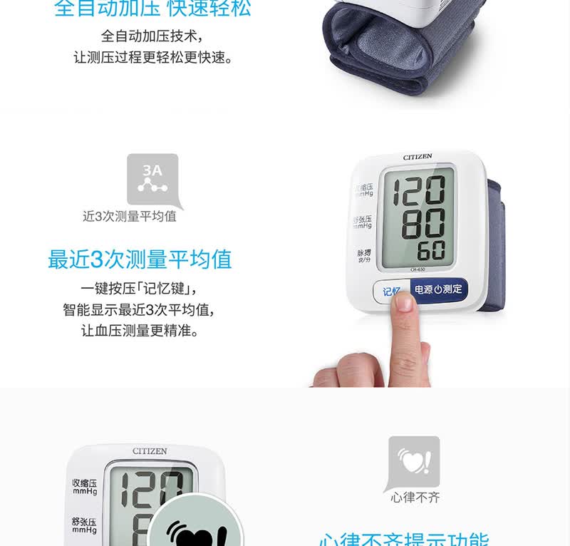 商品名称:西铁城(CITIZEN)全自动数字腕式血压计 CH-650-W