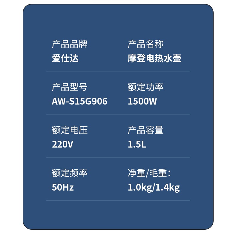 商品名称:爱仕达 摩登电热水壶 / AW-S15G906 1.5L
