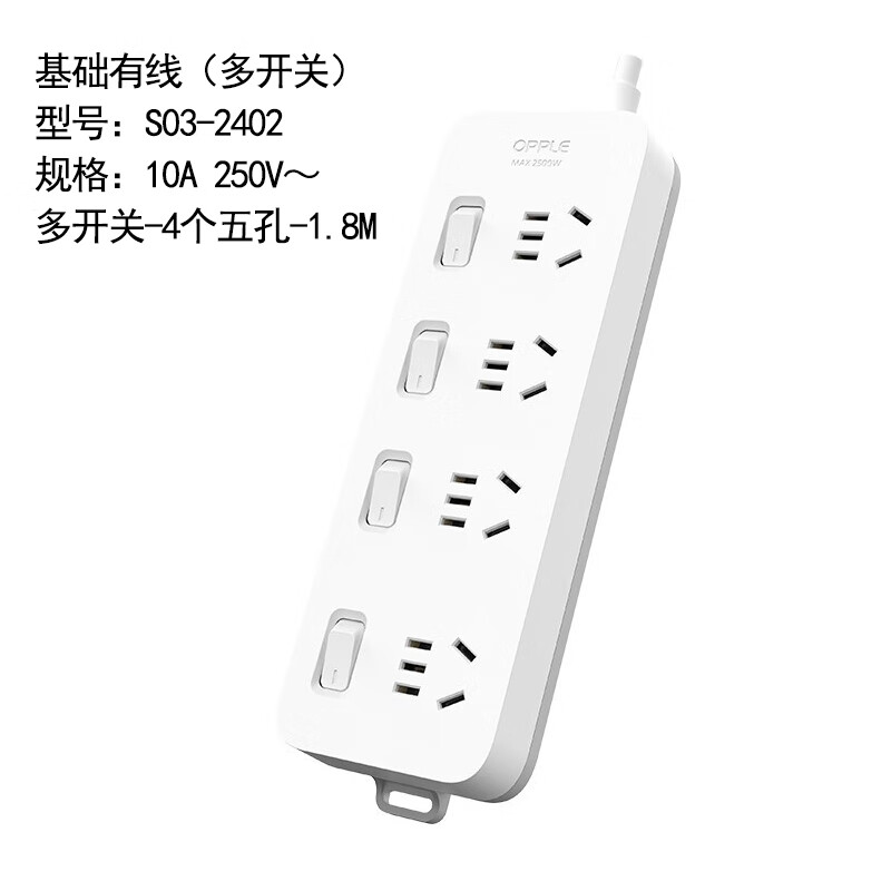 商品名称:欧普照明(OPPLE)S03-2402 国标基础有线排插10A 250V~ 多开关-4个五孔-1.8M