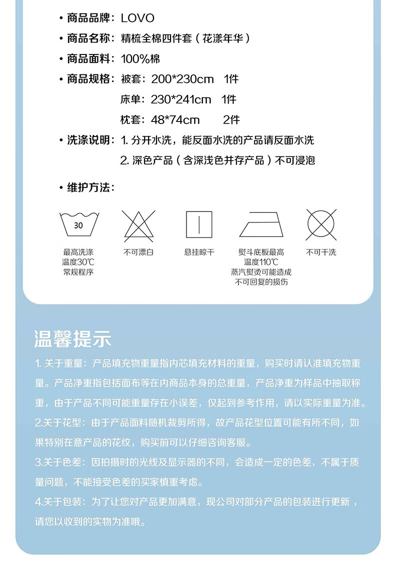 商品名称:LOVO罗莱生活 精梳全棉四件套花漾年华 花漾年华 1.5米床(被套200*230cm) TGVAD0009A/B