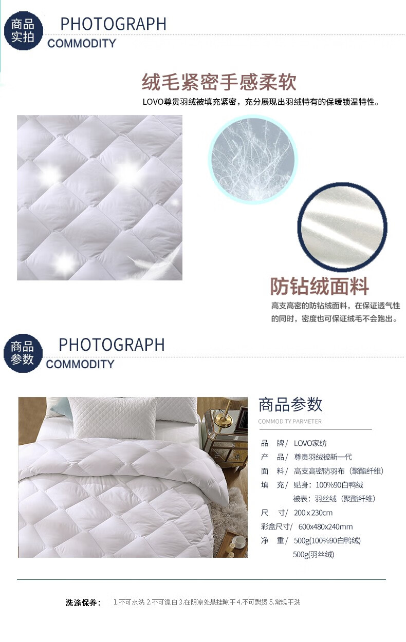 商品名称:LOVO罗莱生活 尊贵羽绒被新一代 VQD2004-1 白色 200x230cm 1000g