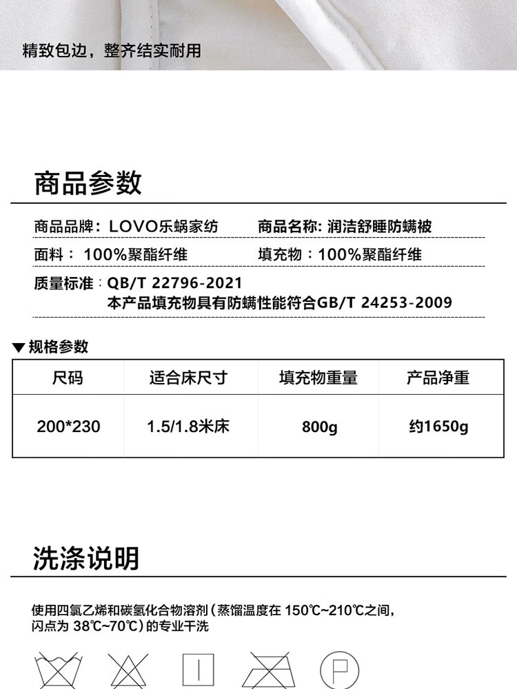 商品名称:LOVO罗莱生活 润洁舒睡防螨被 VTT5000-2 200x230cm