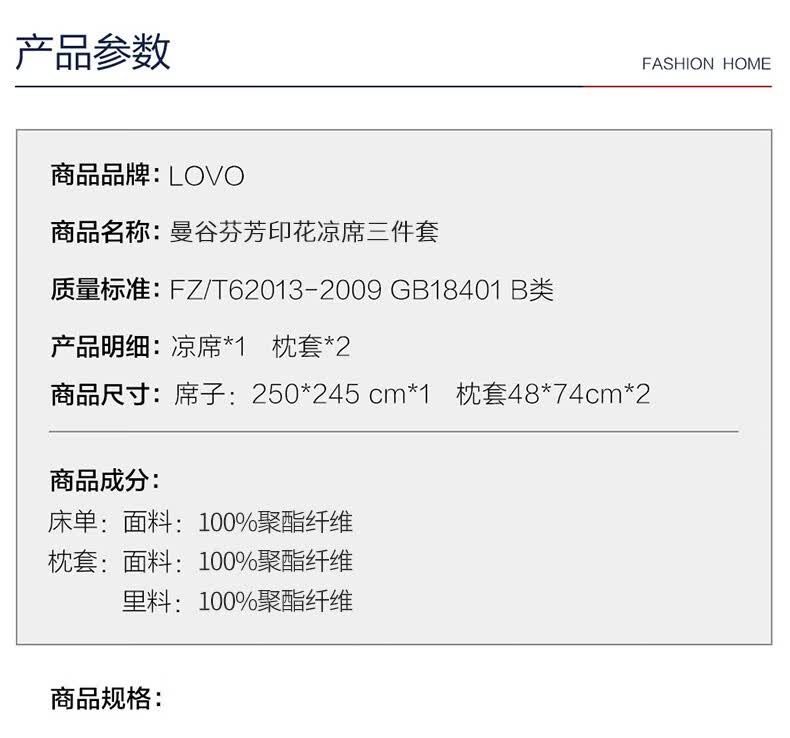 商品名称:LOVO罗莱生活 曼谷芬芳印花凉席三件套 曼谷芬芳 席子250x245cm
