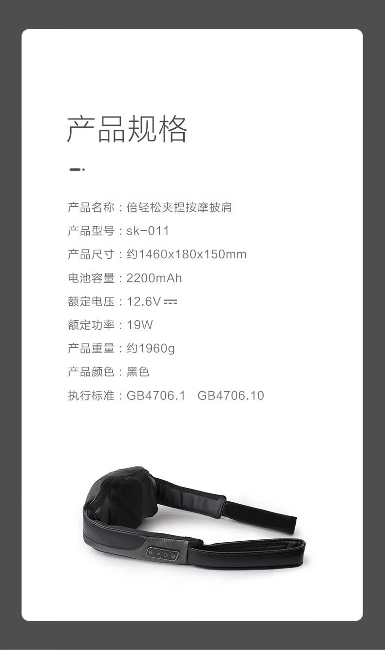 商品名称:倍轻松(breo) 无线夹捏按摩披肩 颈椎按摩器 sk-011 黑色