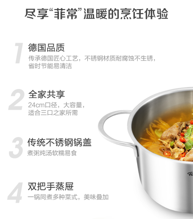 商品名称:菲仕乐新家庭系列24厘米汤锅配套蒸屉套组EMP-SS2421N03(锅)/EMI-SS2421N03(蒸屉)