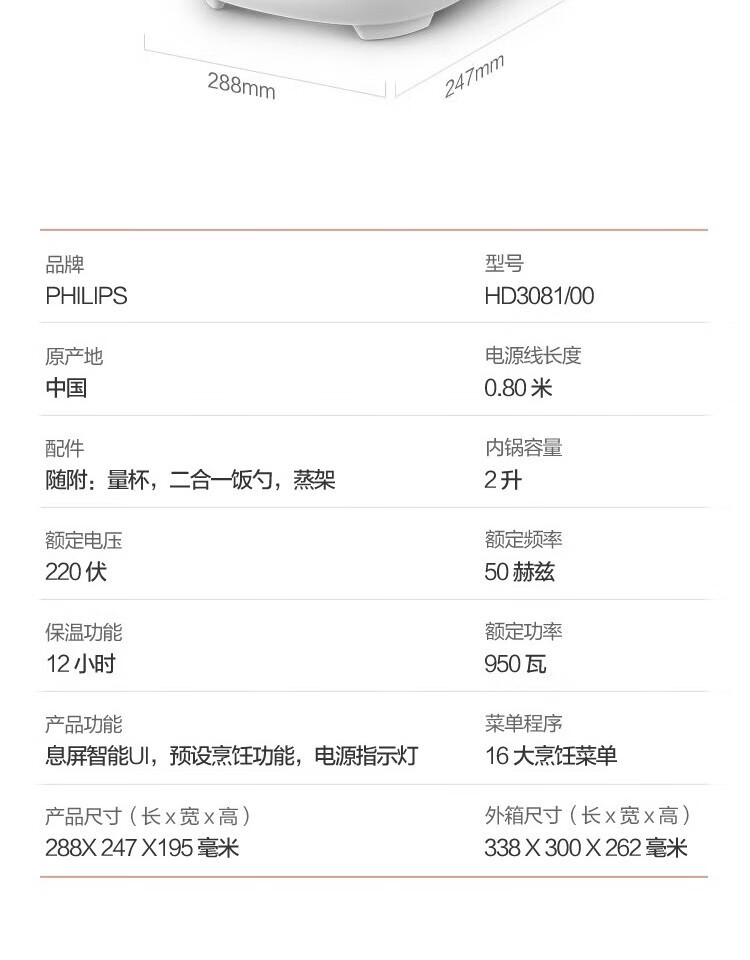 商品名称:飞利浦(PHILIPS)电饭煲 HD3081/00 2L