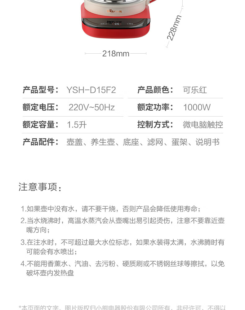 商品名称:小熊(Bear)电热水壶(养生壶)YSH-D15F2