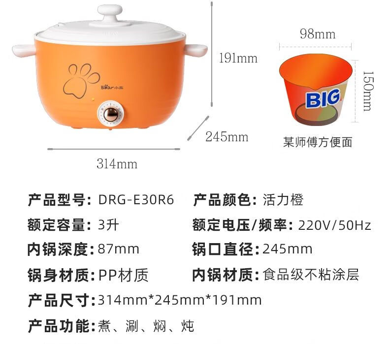 商品名称:小熊(Bear) 多用途电热锅 DRG-E30R6