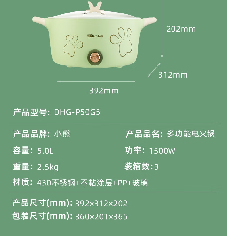 商品名称:小熊(Bear) 多功能电火锅5L DHG-P50G5