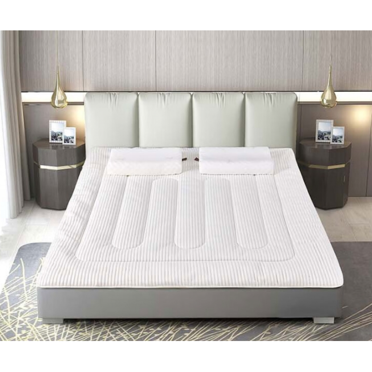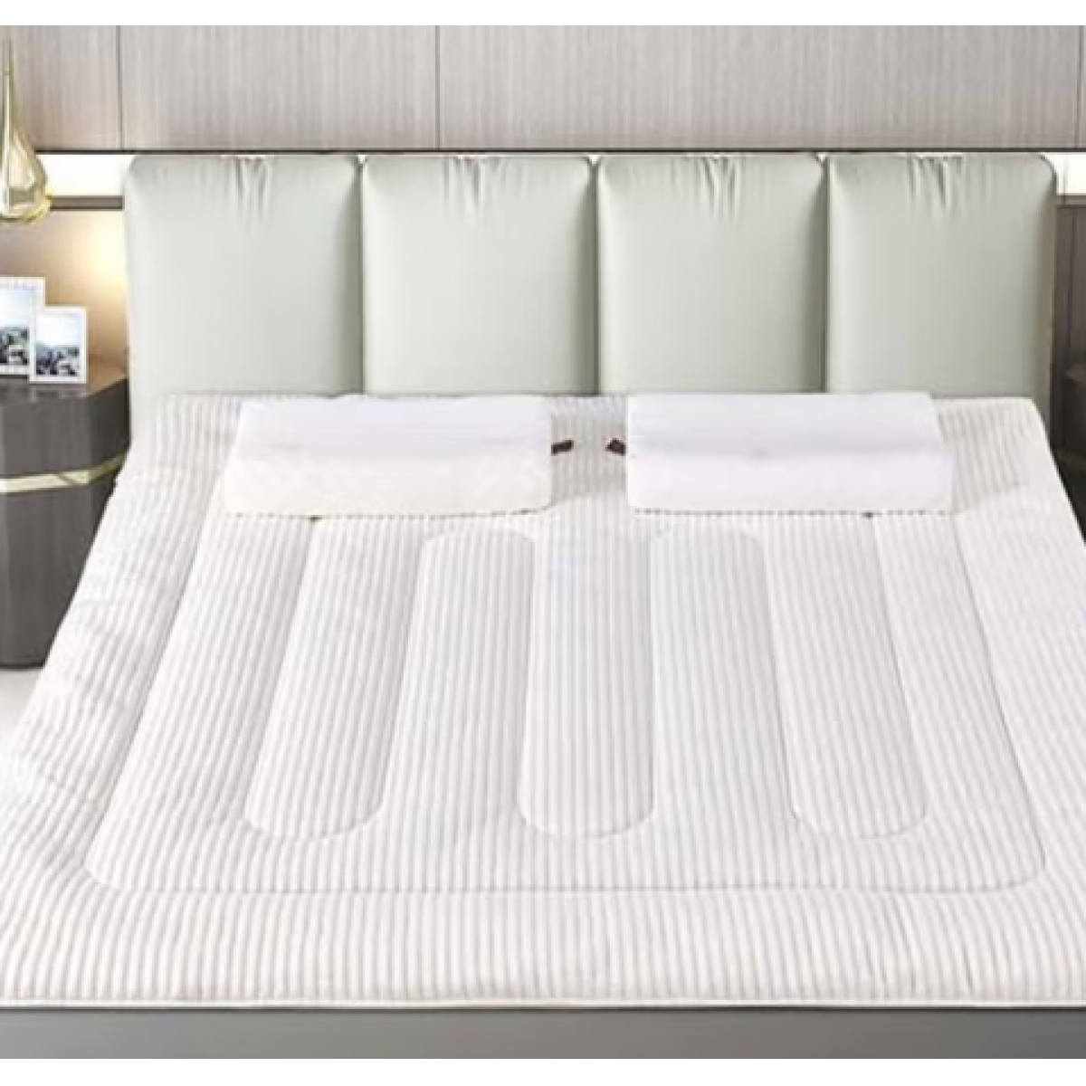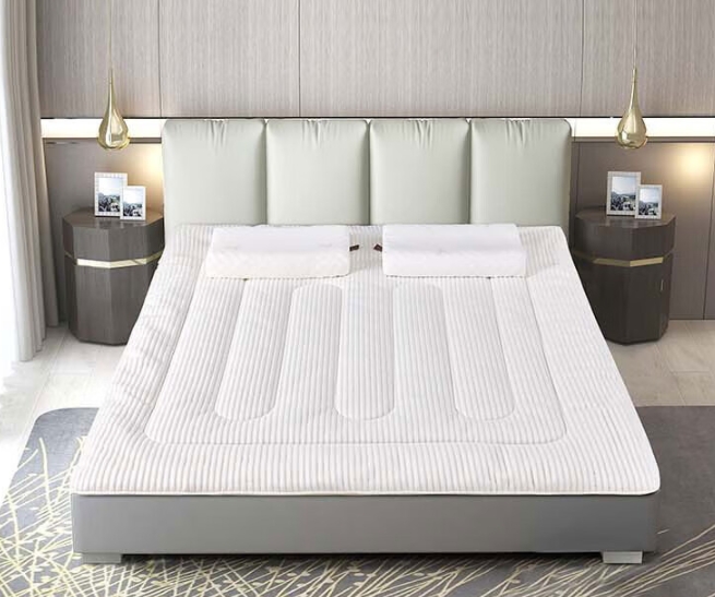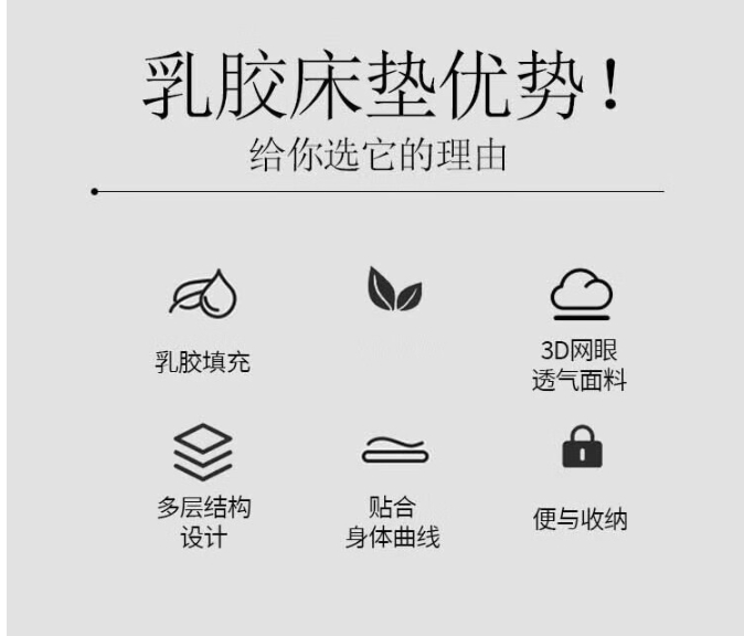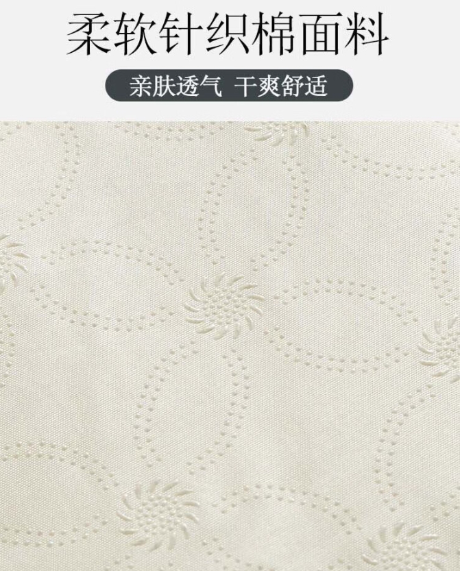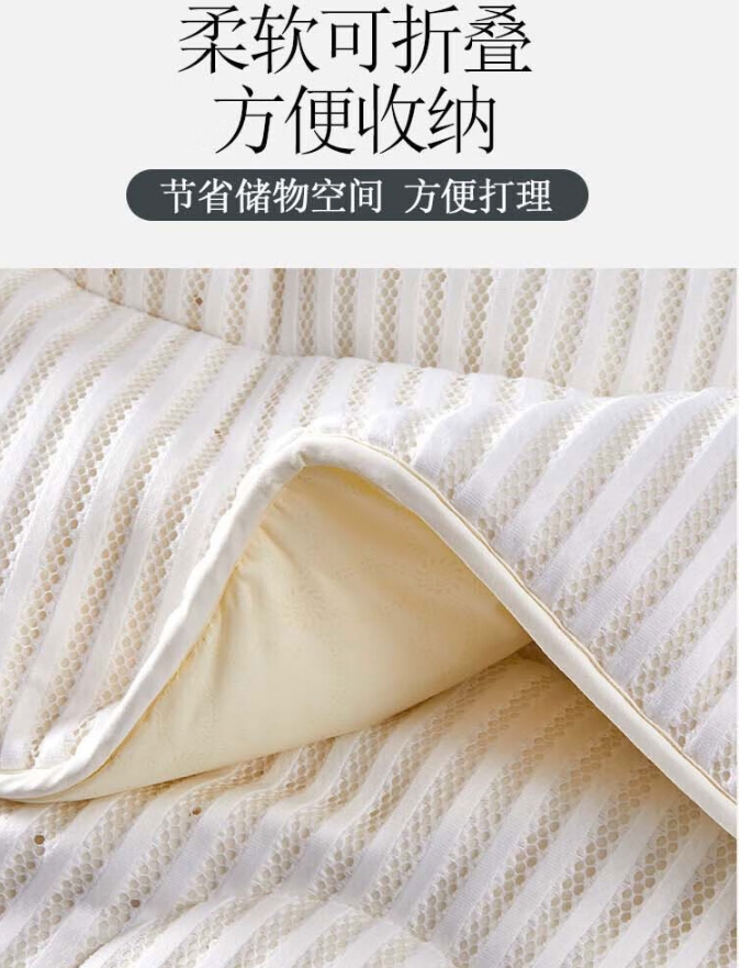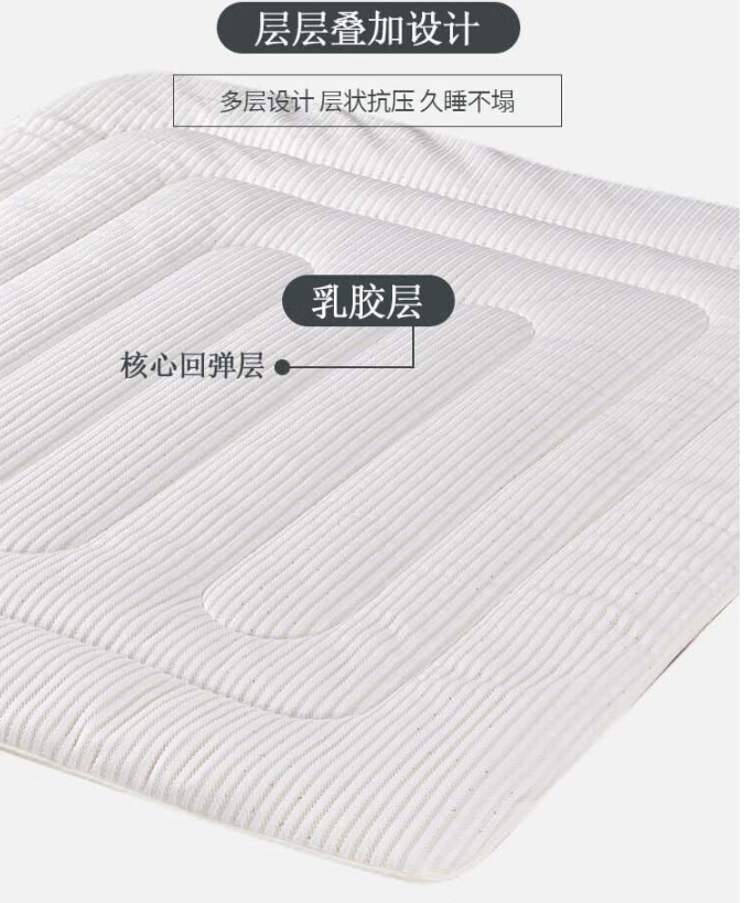 乳胶床垫,呵护脊椎,正面3D加厚针织棉,反面透气防滑布。乳胶垫,采用乳胶跟高密度抗压纤维棉,支撑力好,回弹性好,不变形。