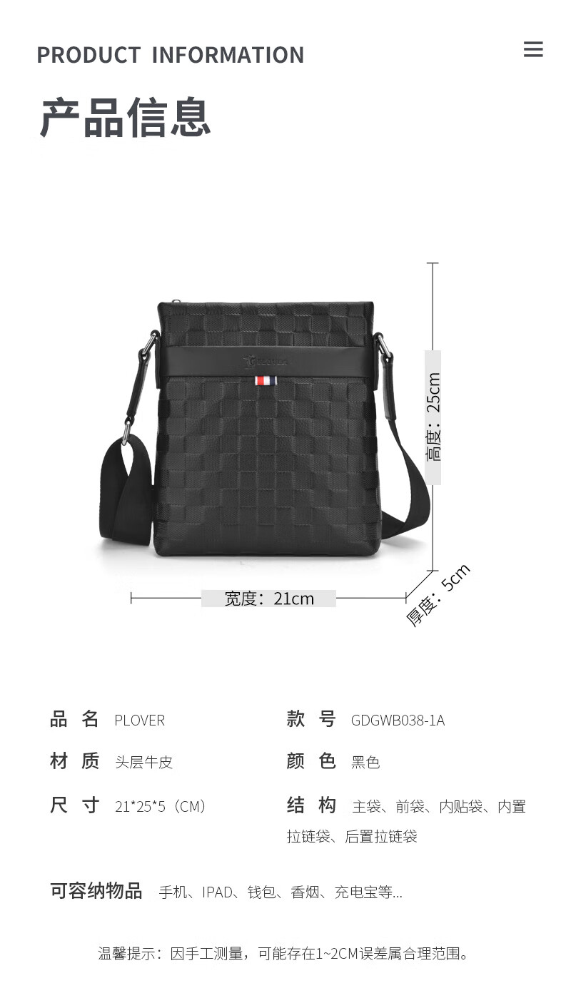 商品名称:啄木鸟 PLOVER 单肩包斜挎包 GDGWB038-1A 21*25*5CM