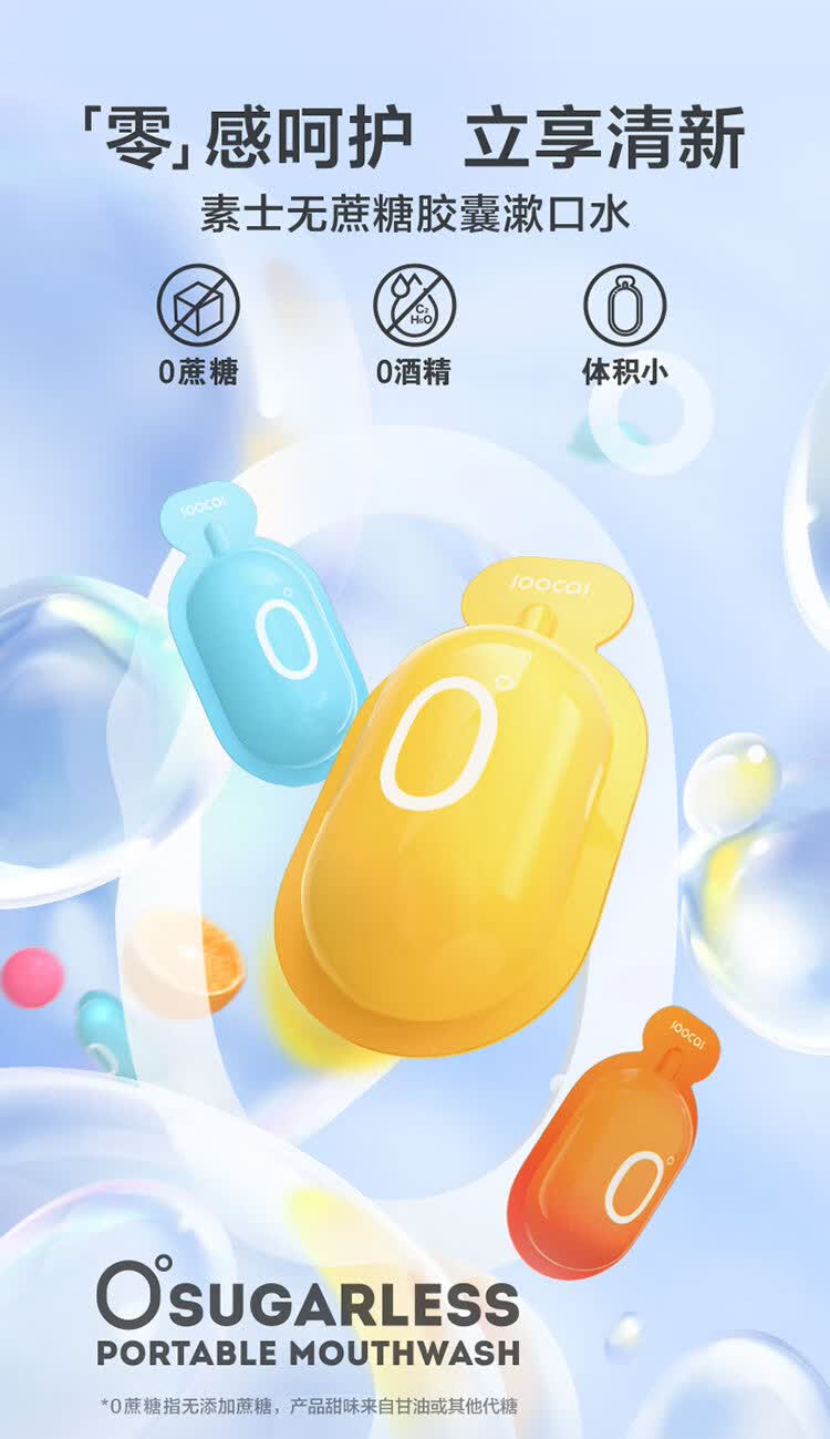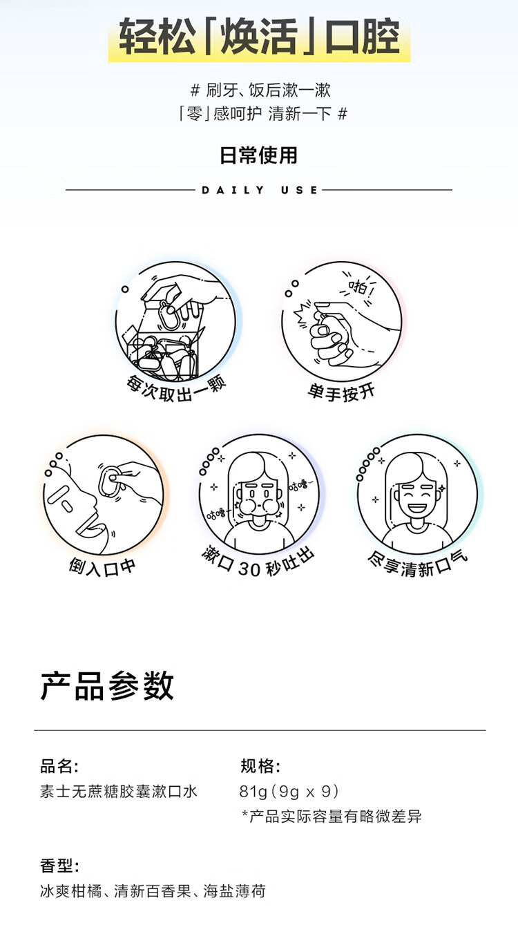 商品名称:素士无蔗糖便携漱口水持久留香男女生口腔清洁清新口气 无蔗糖漱口水10mL-9颗装
