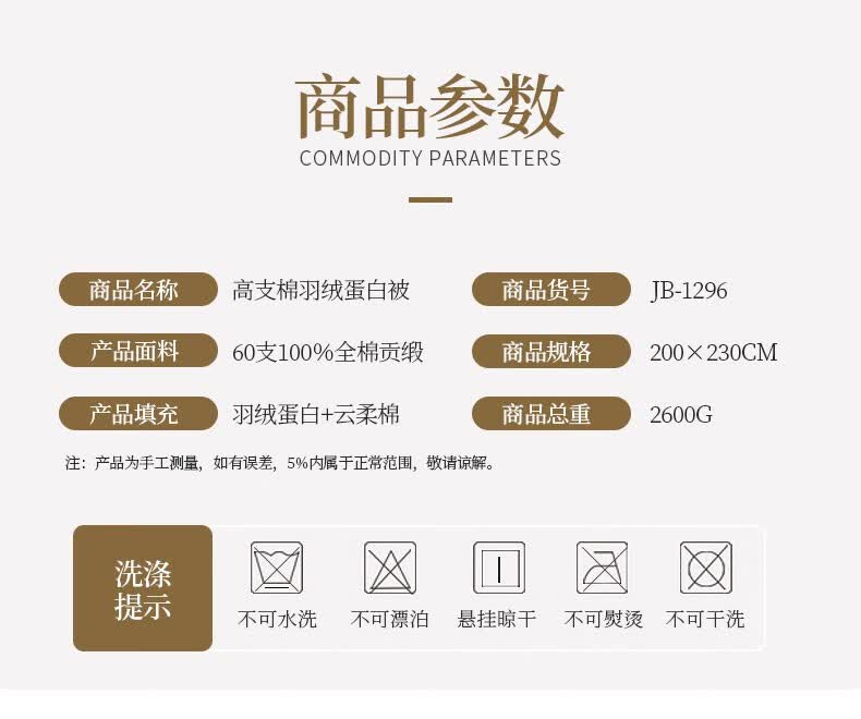 商品名称:金丝莉 高支棉羽绒蛋白被 JB-1296 200x230cm