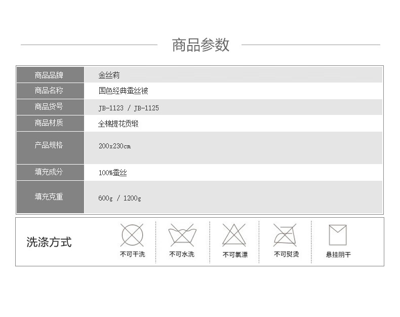 商品名称:金丝莉KINTHERI 国色经典蚕丝被 JB-1123 600g 200×230cm