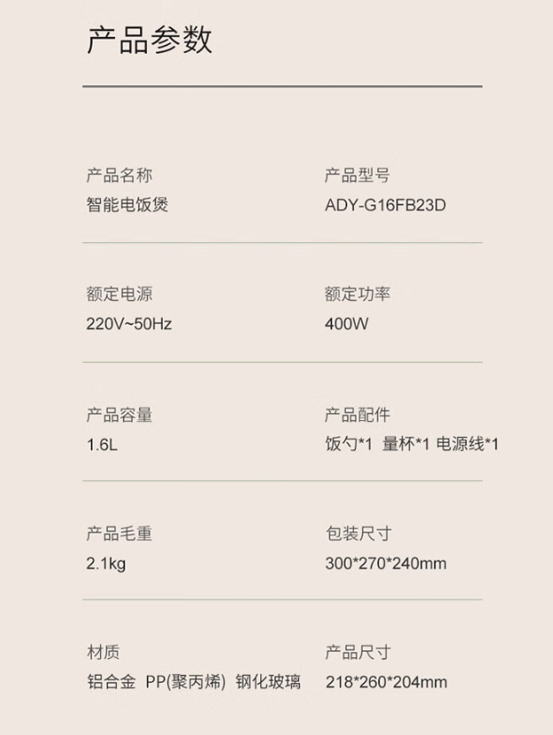 商品名称:北美电器 智能电饭煲 ADY-G16FB23D 1.6L