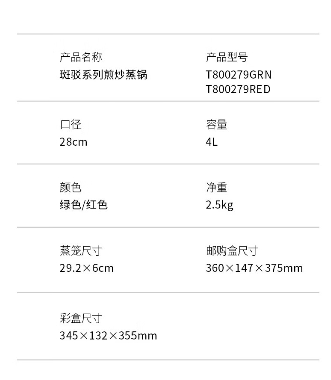 商品名称:Tower 斑驳系列煎炒蒸锅 T800279RED/T800279GRN 4L
