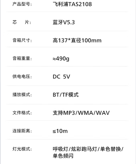 商品名称:飞利浦 S2108 炫彩蓝牙音箱