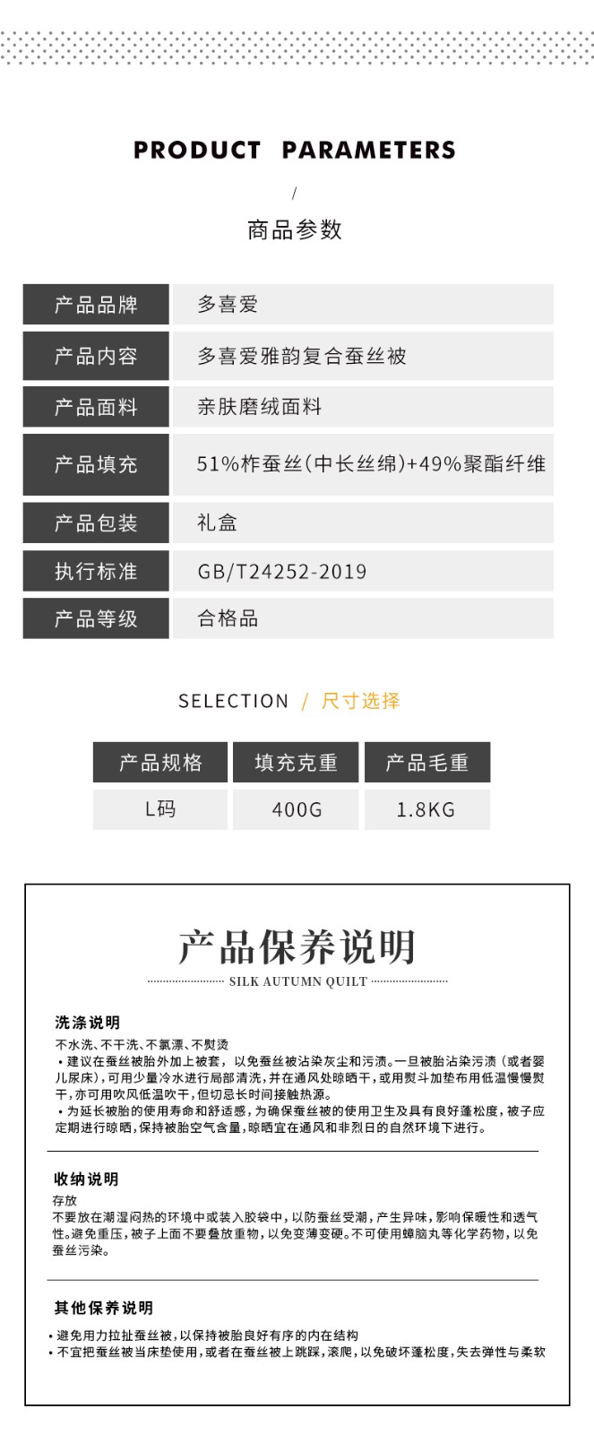 商品名称:多喜爱Dohia 雅韵复合蚕丝被 203*229cm(400G)