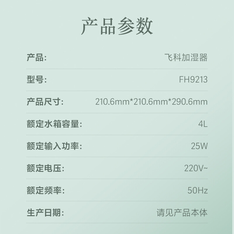 商品名称:飞科(FLYCO) 空气加湿器 4L FH9213