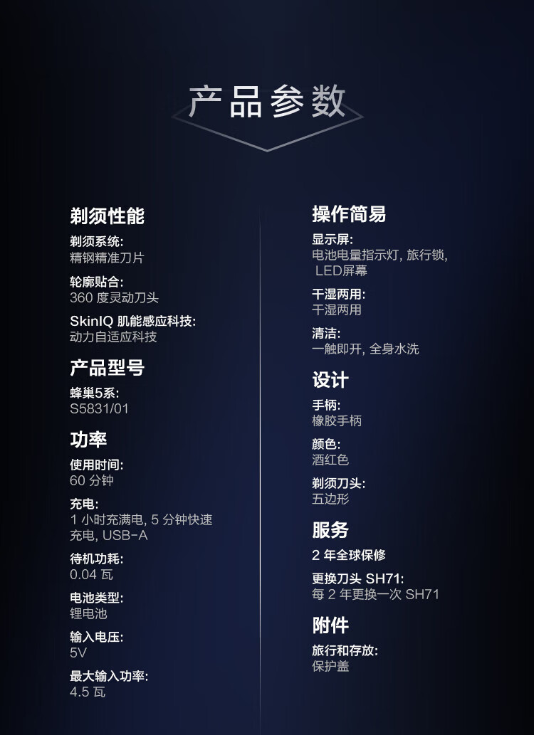 商品名称:飞利浦(PHILIPS)剃须刀电动 S5831