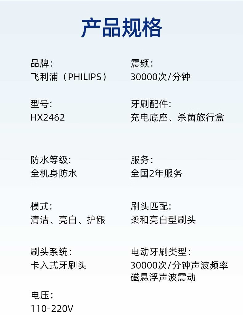 商品名称:飞利浦 电动牙刷 HX2462/01 粉 HX2462/02蓝
