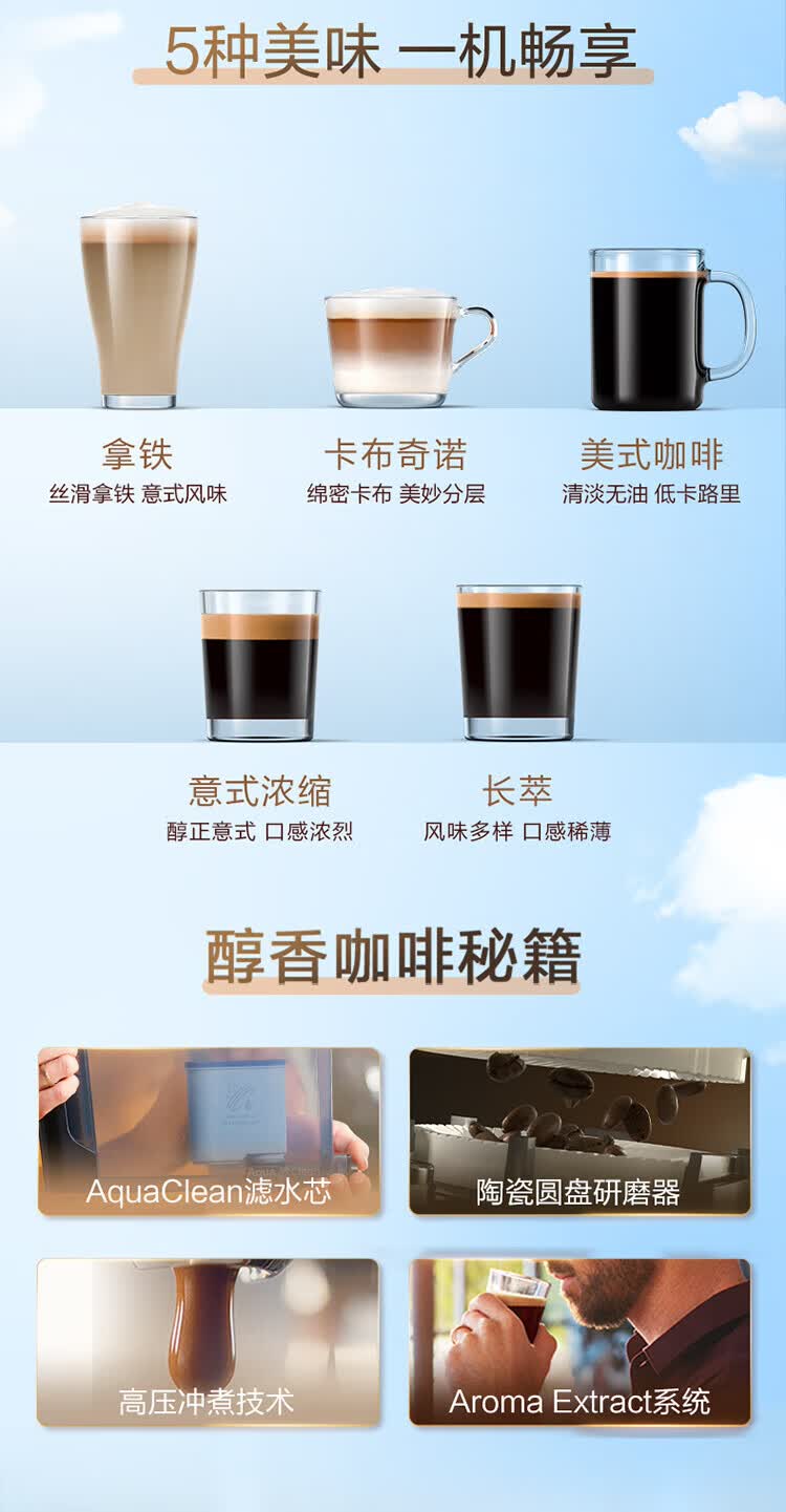 制作口味 :意式浓缩,美式咖啡,卡布奇诺,花式咖饮,摩卡,拿铁,奶泡