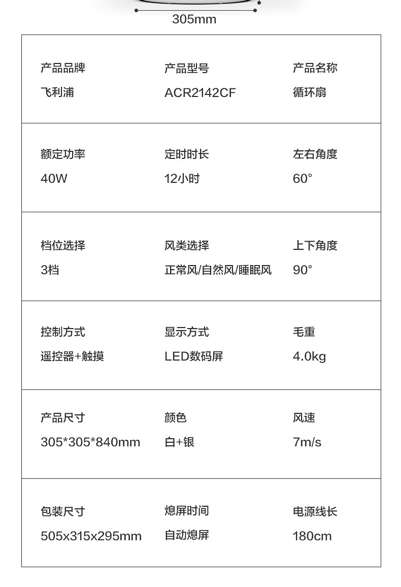 商品名称:飞利浦(PHILIPS)空气循环扇电风扇 ACR2142CF