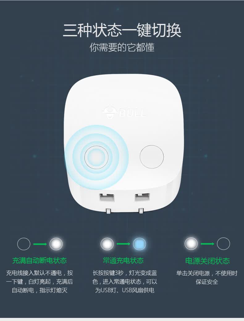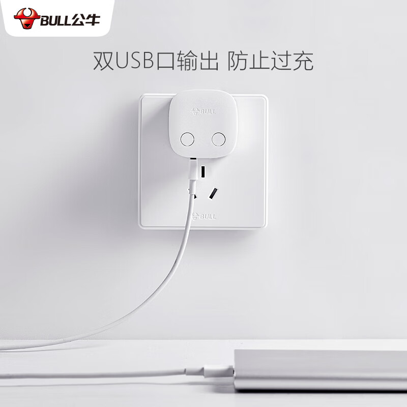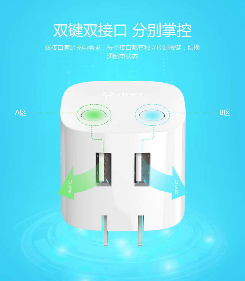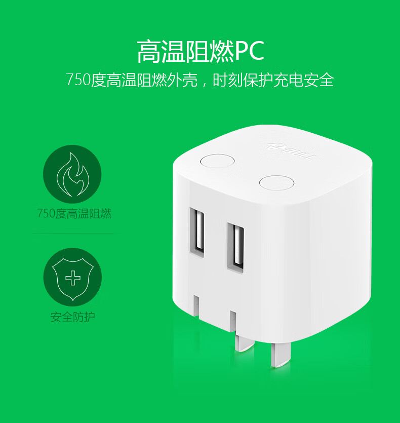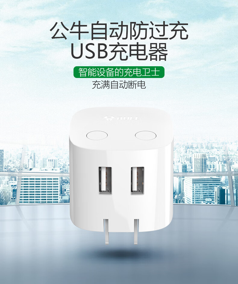商品名称:公牛BULL 自动防过充USB充电器—U212T