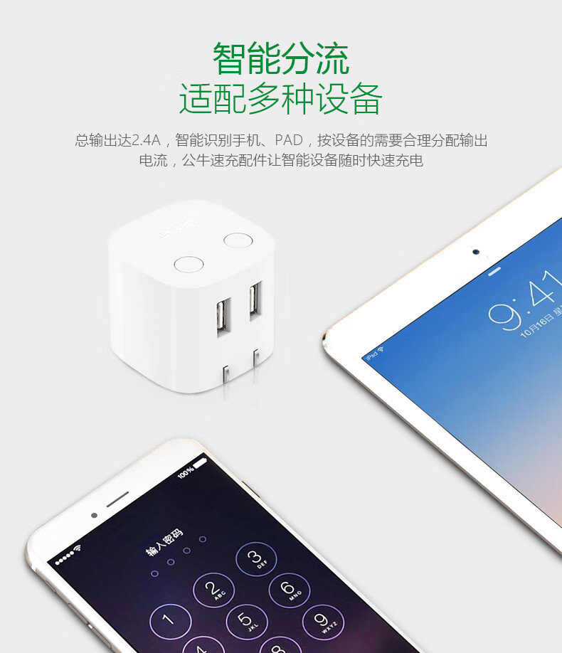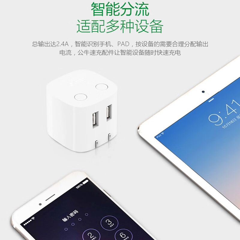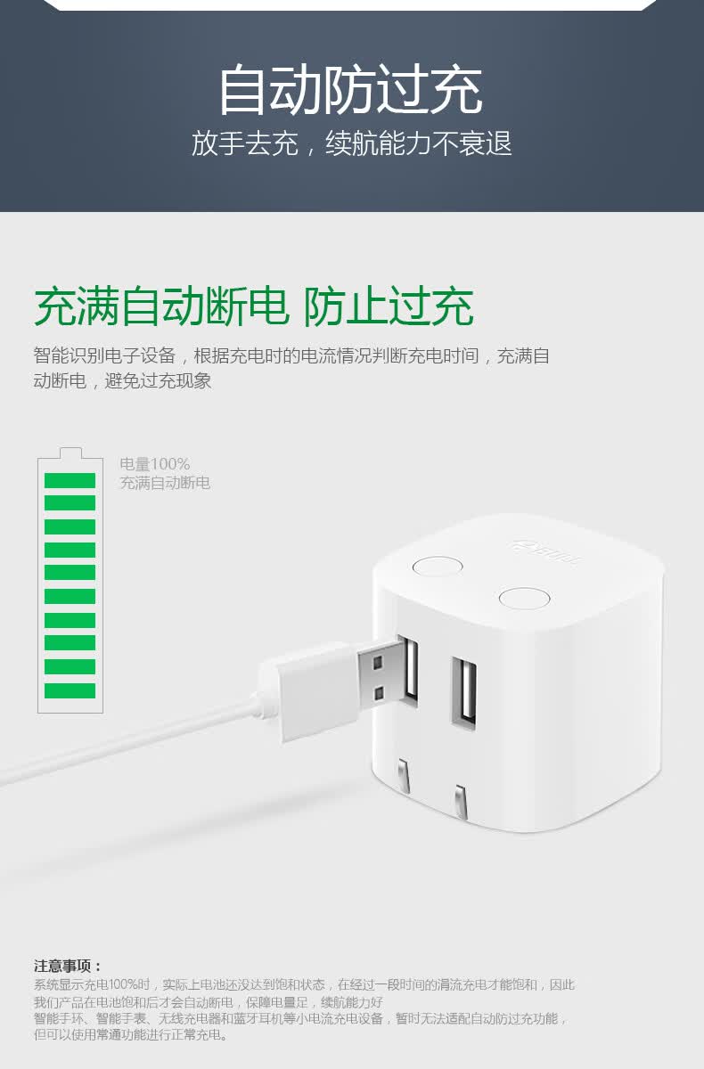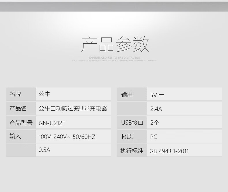 商品名称:公牛BULL 自动防过充USB充电器—U212T