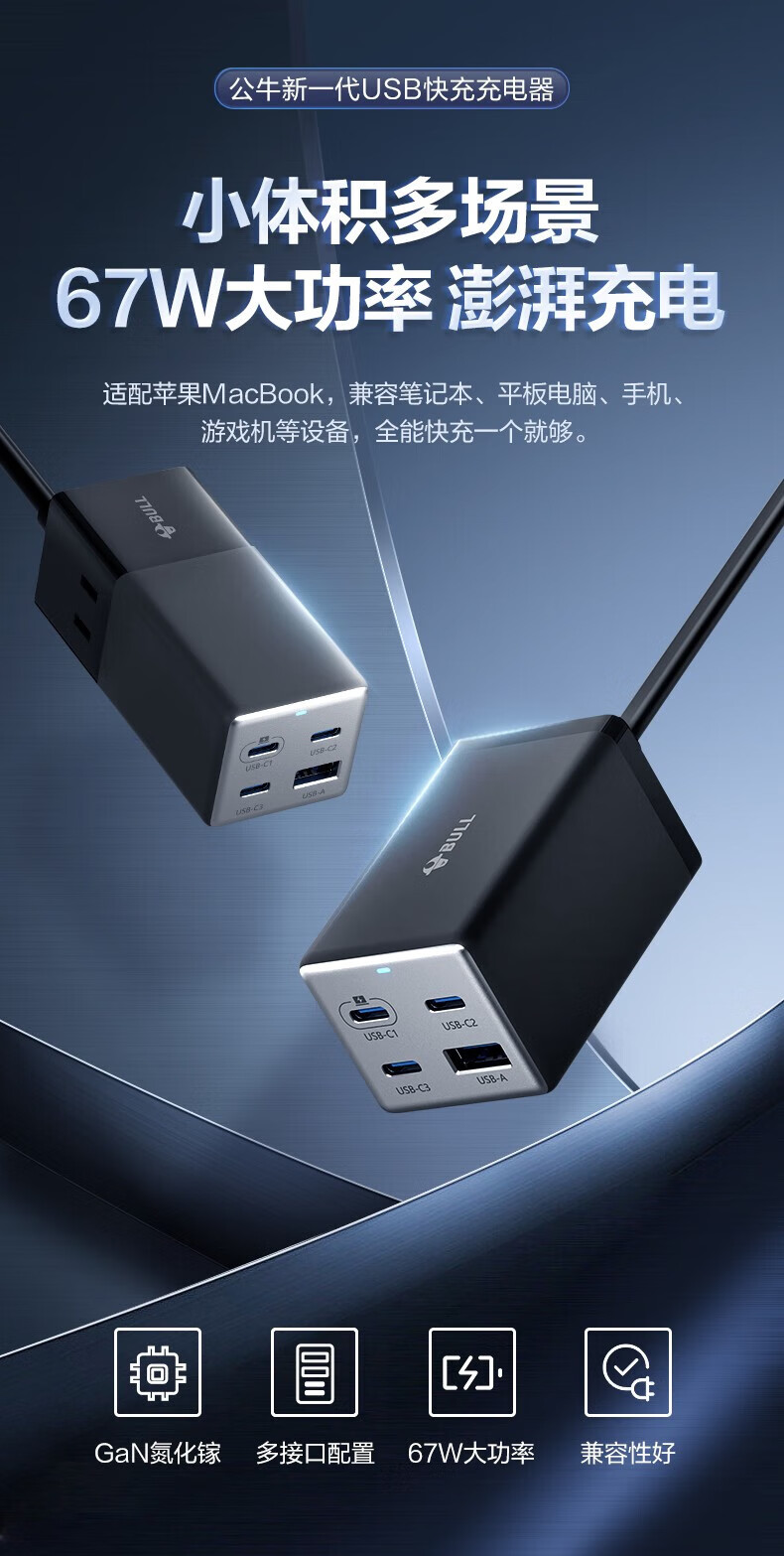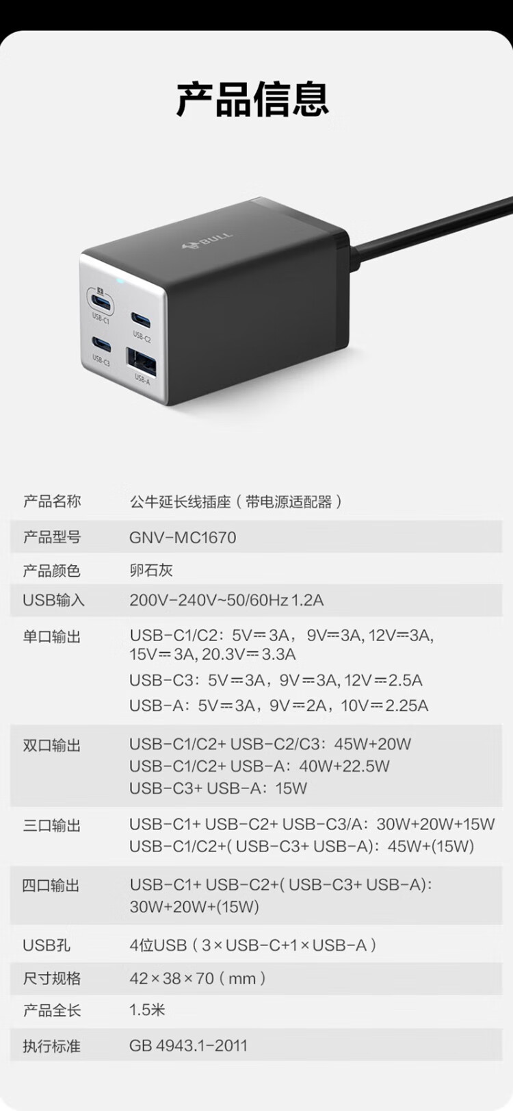 商品名称:公牛(BULL)67W氮化镓便携插座 GNV-MC1670