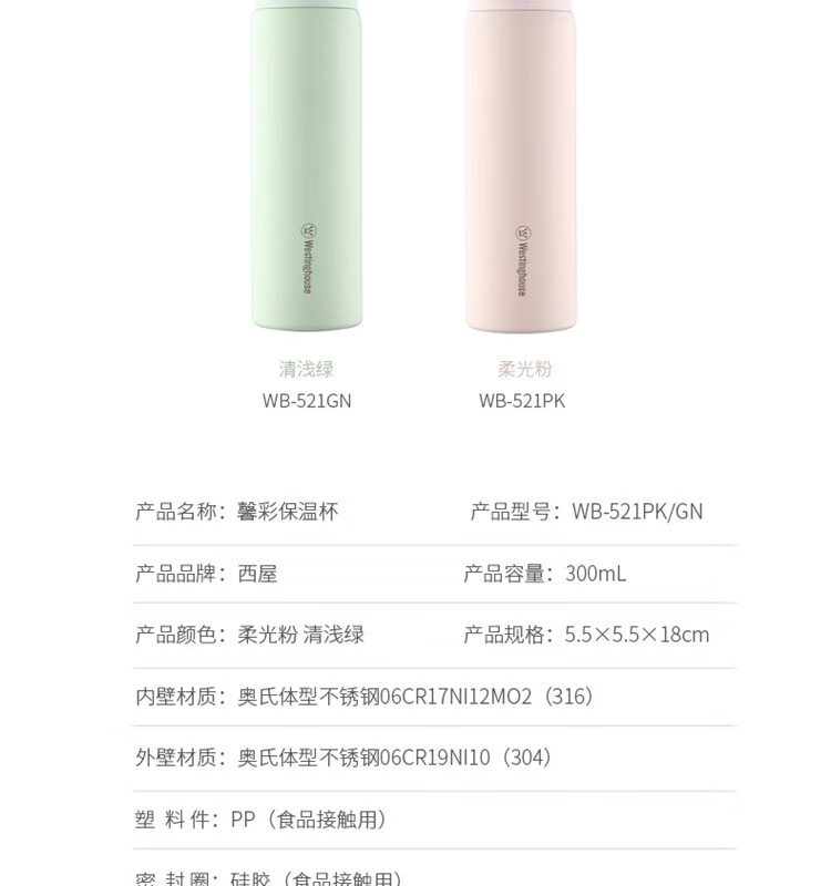 商品名称:西屋(Westinghouse)馨彩保温杯 WB-521PK(柔光粉)/GN(清浅绿)300mL
