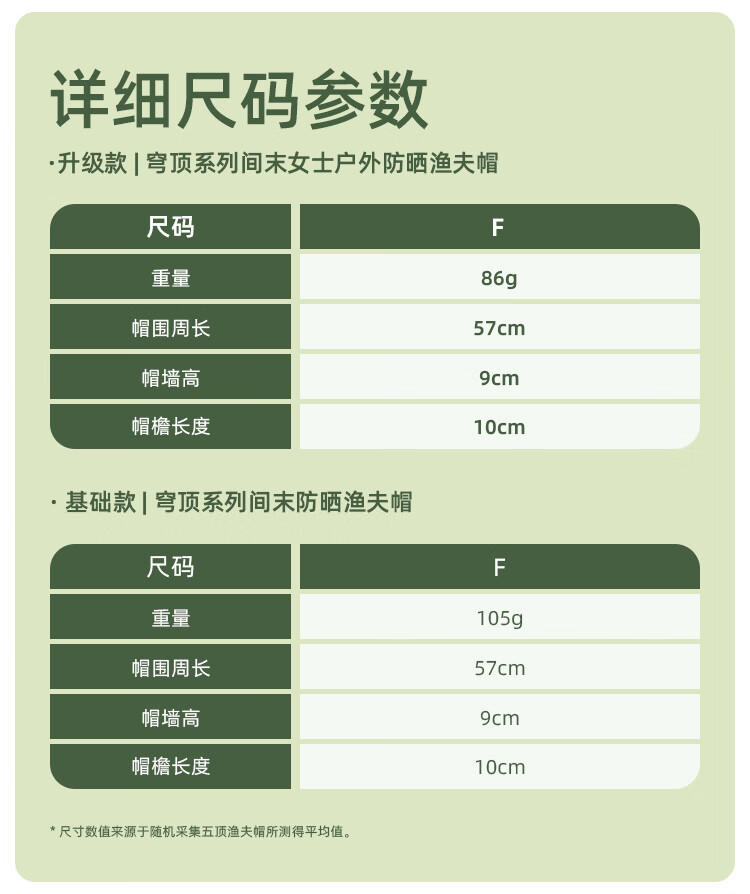 尺寸 :帽围周长:57cm、帽檐长度:10cm、帽墙高:9cm