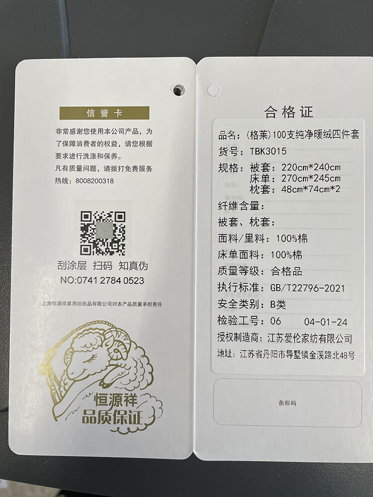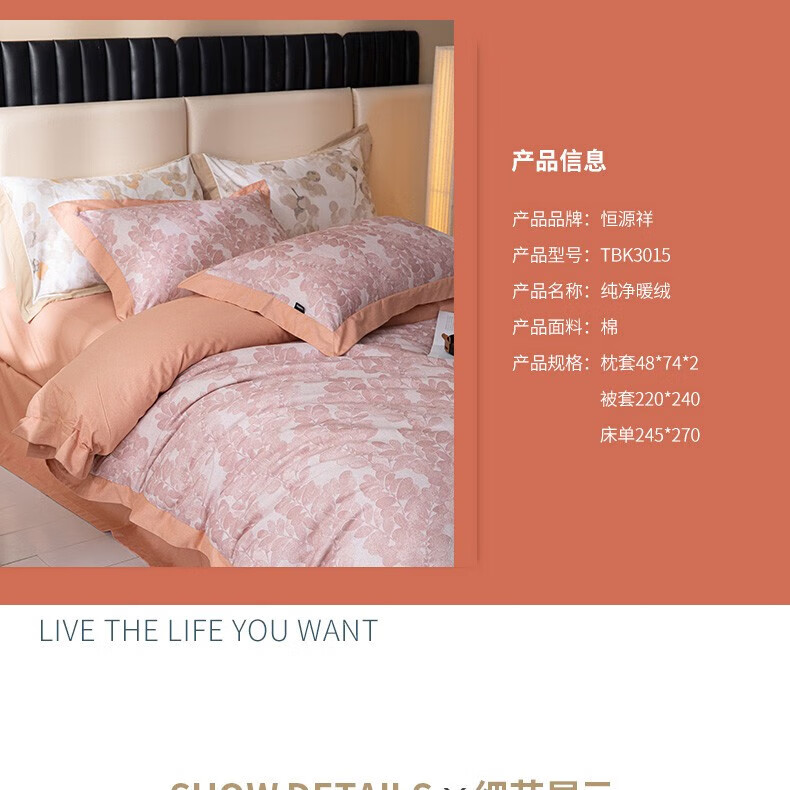 商品名称:恒源祥 格莱100支纯净暖绒四件套 TBK3015 220*240cm