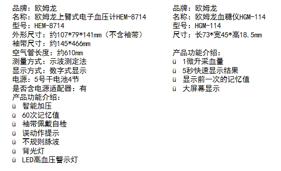 规格 :欧姆龙上臂式电子血压计HEM-8714*1 欧姆龙血糖仪HGM-114单机*1 血糖仪25试纸针*1 欧姆龙收纳包*1