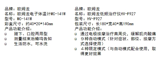 规格 :欧姆龙电子体温计MC-141*1 欧姆龙低频治疗器HEM-927*1 欧姆龙收纳包*1