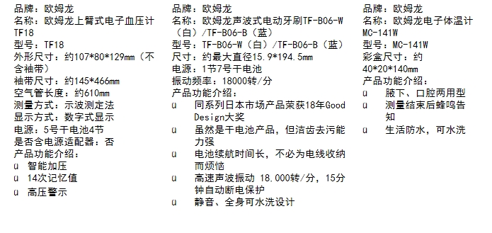 规格 :欧姆龙电子体温计MC-141*1 欧姆龙上臂式电子血压计TF18*1 欧姆龙声波式电动牙刷TF-B06-W*1 欧姆龙收纳包*1